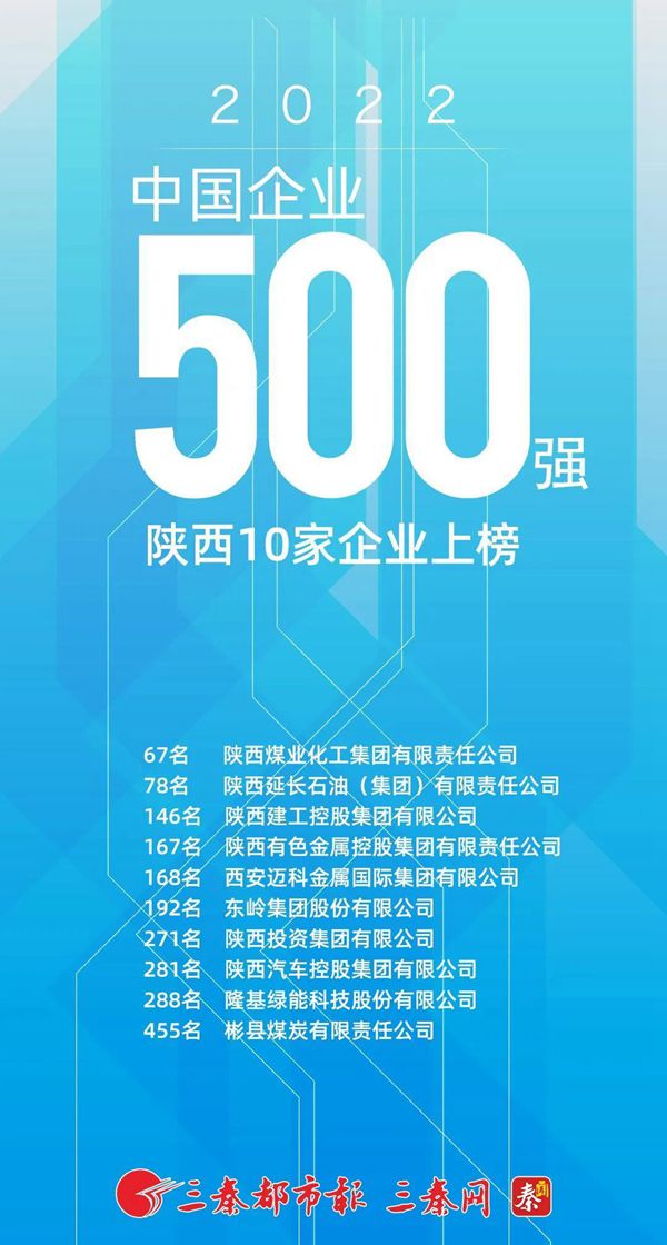 陕煤集团位列2022中国企业500强第67位,蝉联上榜陕企第一