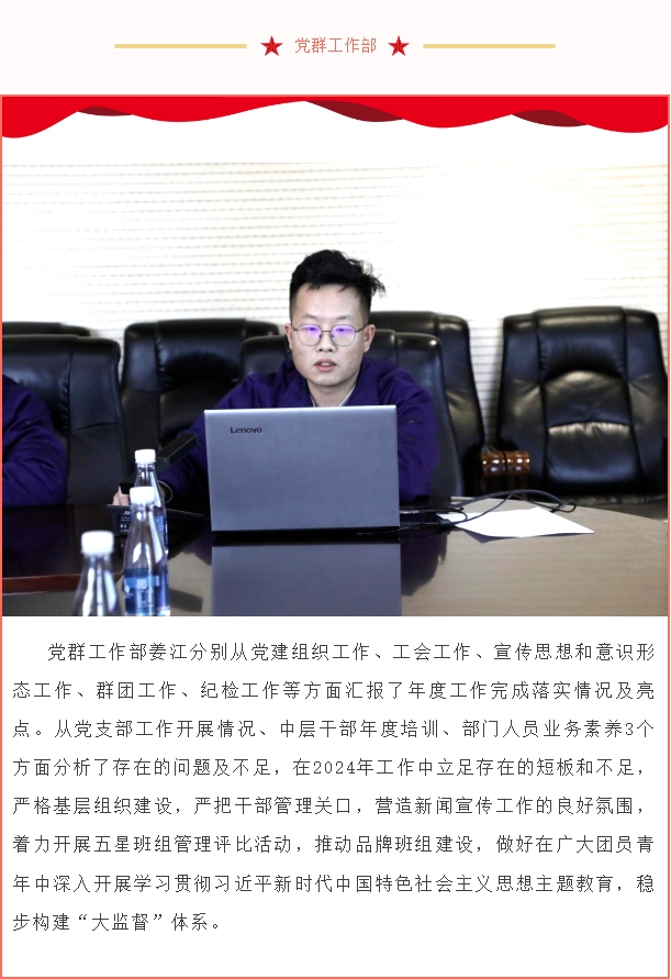 乐动体育在线各分乐动体育在线、各部门主要负责人围绕乐动体育在线战略定位,聚焦提质增效发展目标及各自工作,亮成绩比干劲、揭短板找差距、讲问题谈对策、碰思想出点子,乐动体育在线领导班子成员对各分乐动体育在线、各部门工作进行总结点评,深入交流思想,坦诚查摆问题,并提出整改措施,对下一步工作进行研究部署。全体与会人员在畅所欲言、各抒己见中,思想进一步统一、工作进一步聚焦、思路进一步明确。